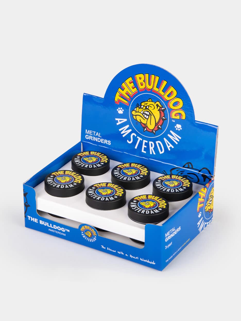 The Bulldog Grinder Metaal 3-Delig in Zwart combineert stijl en functionaliteit met een matte zwarte afwerking en een full-colour print van het iconische originele logo.