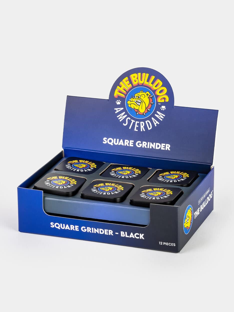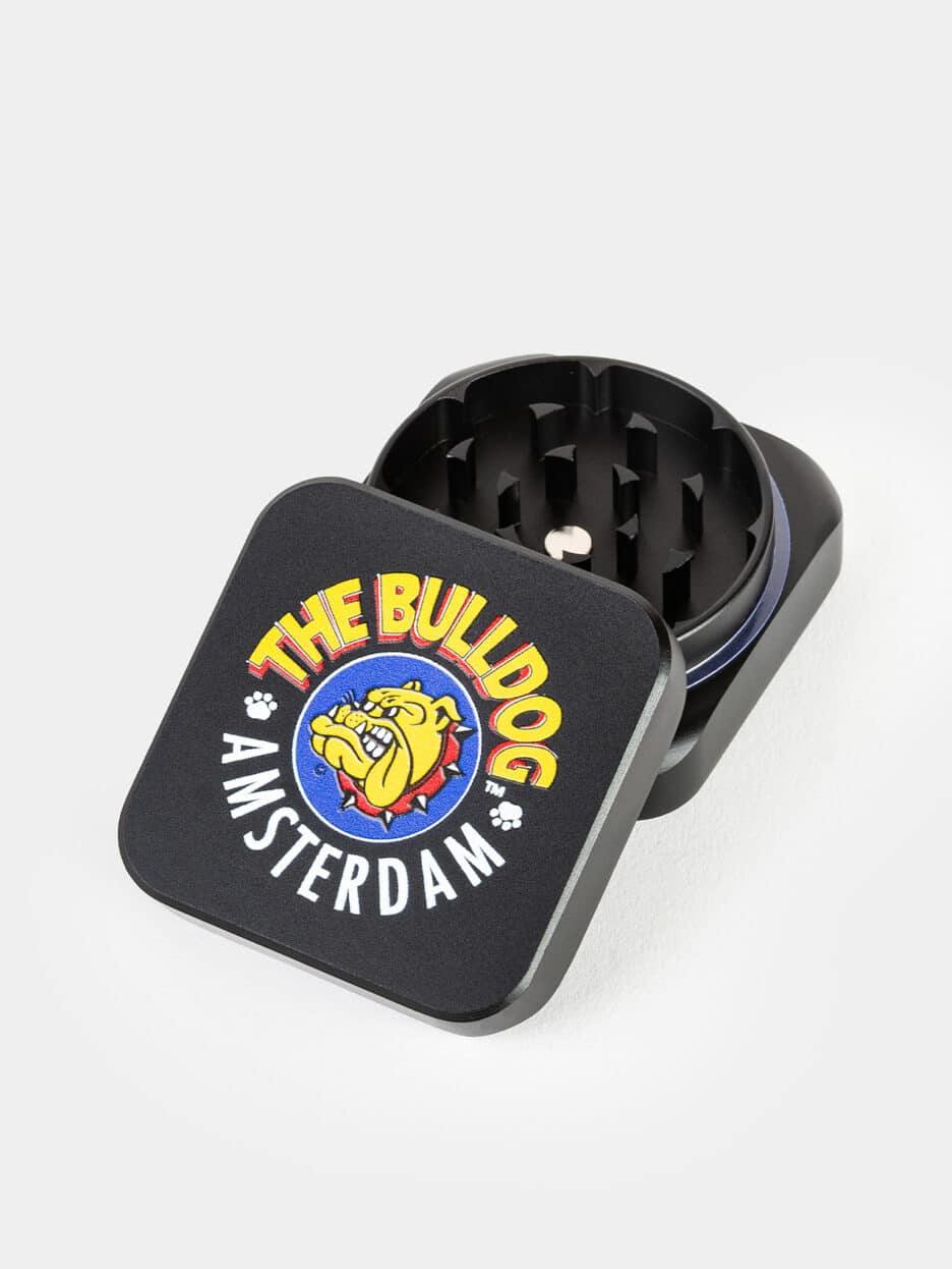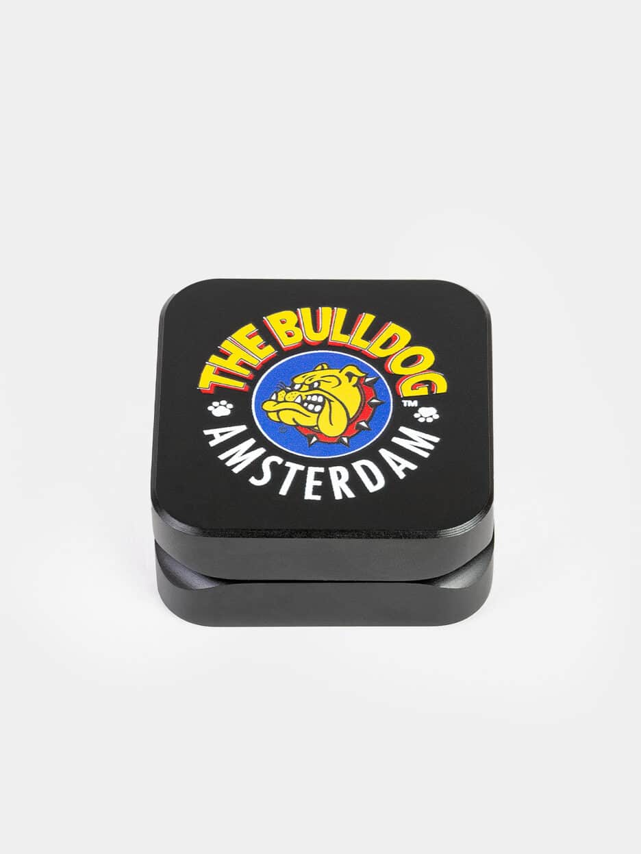 De Square Grinder is een stevige, zwarte aluminium grinder met het full‑color Originele The Bulldog‑logo