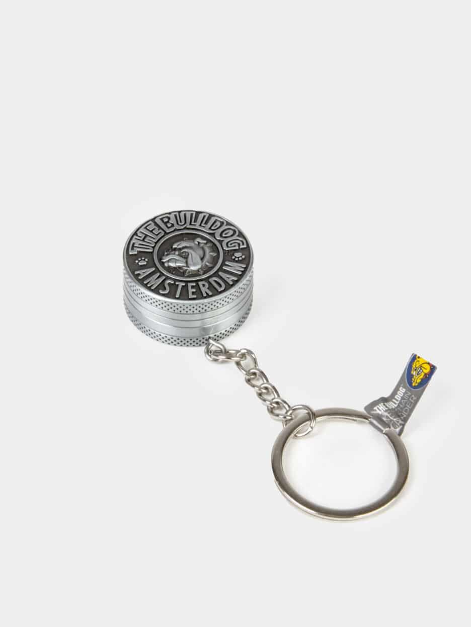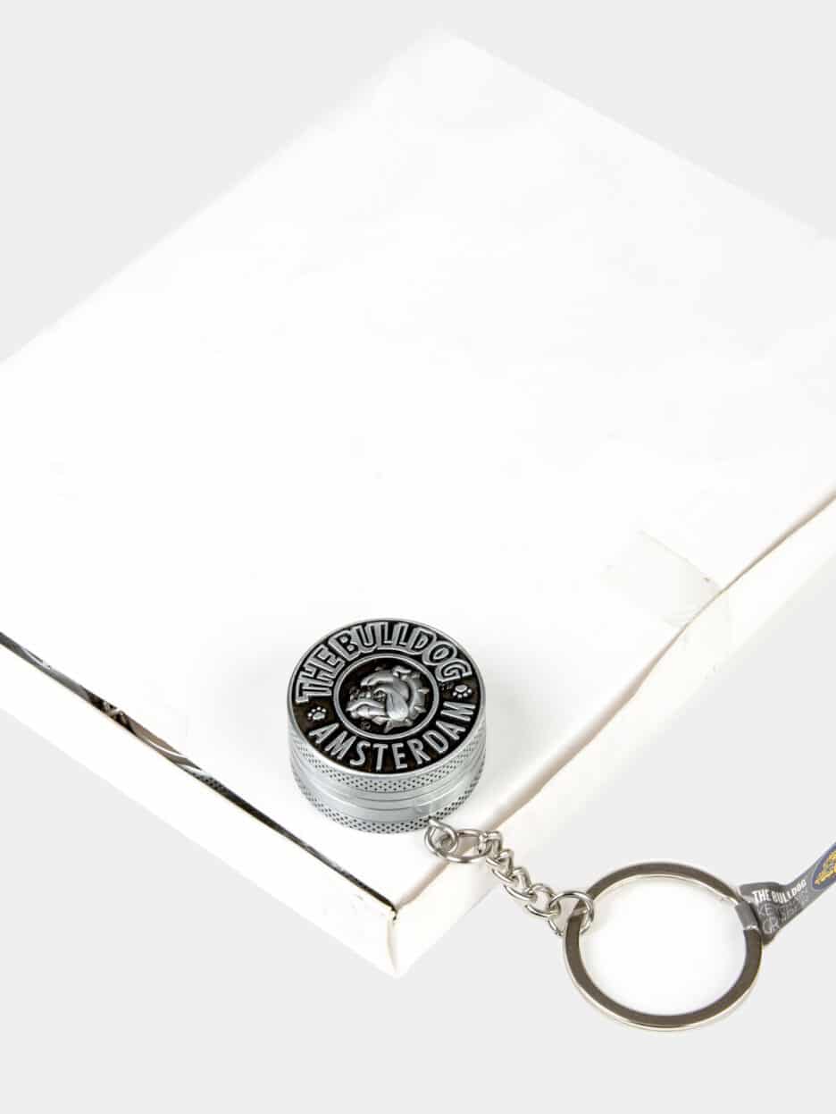 The Bulldog 2-Part Keychain Mini Grinder Amsterdam with diamond teeth and embossed original logo on top.