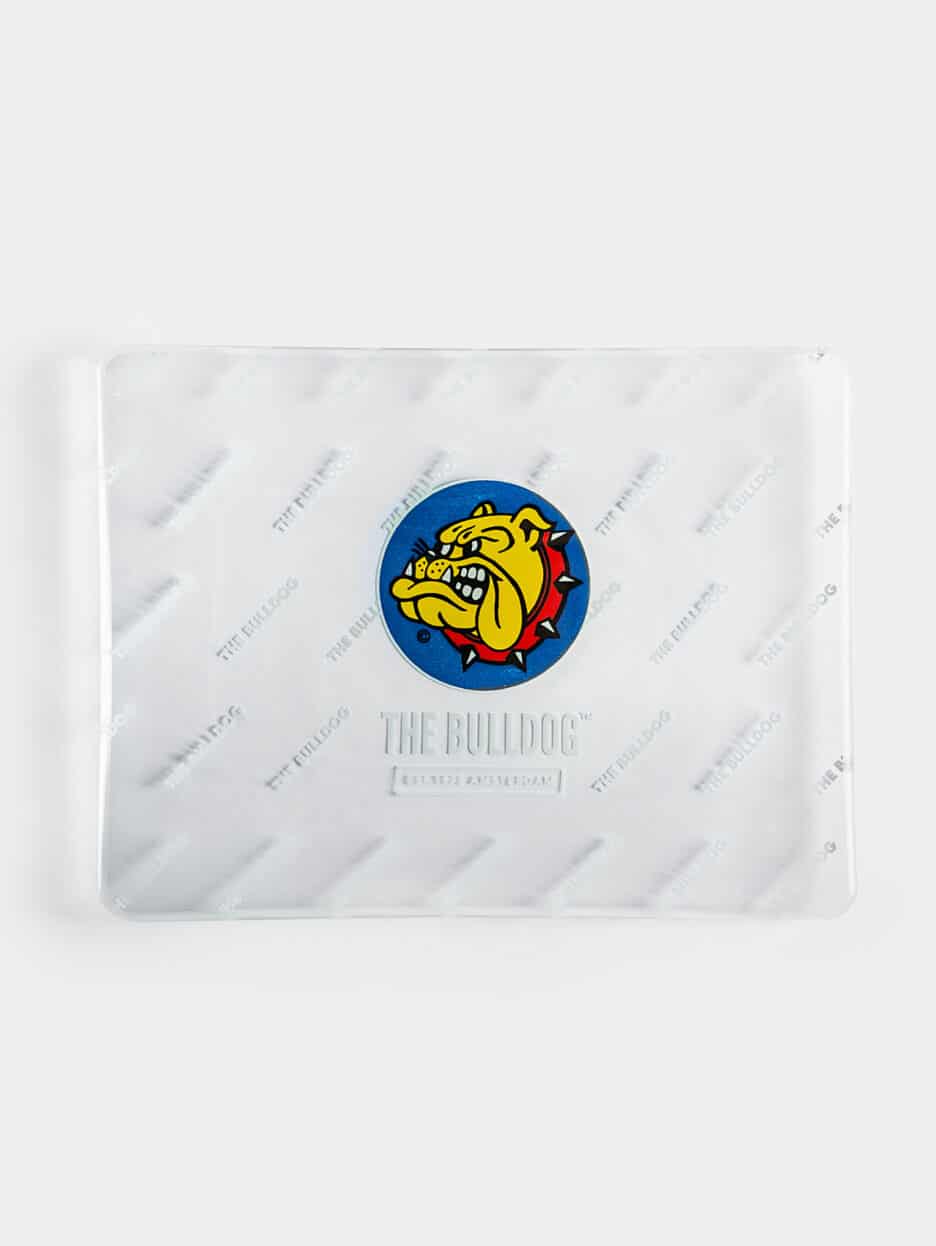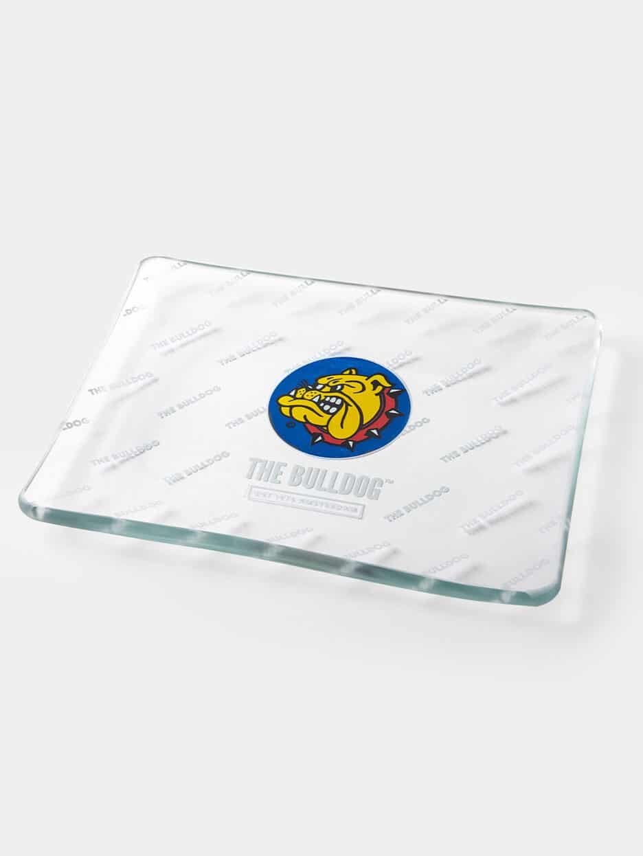 Shatterproof glass rolling tray with raised edges, featuring the full‑color Bulldog head and ‘The Bulldog’ in white.