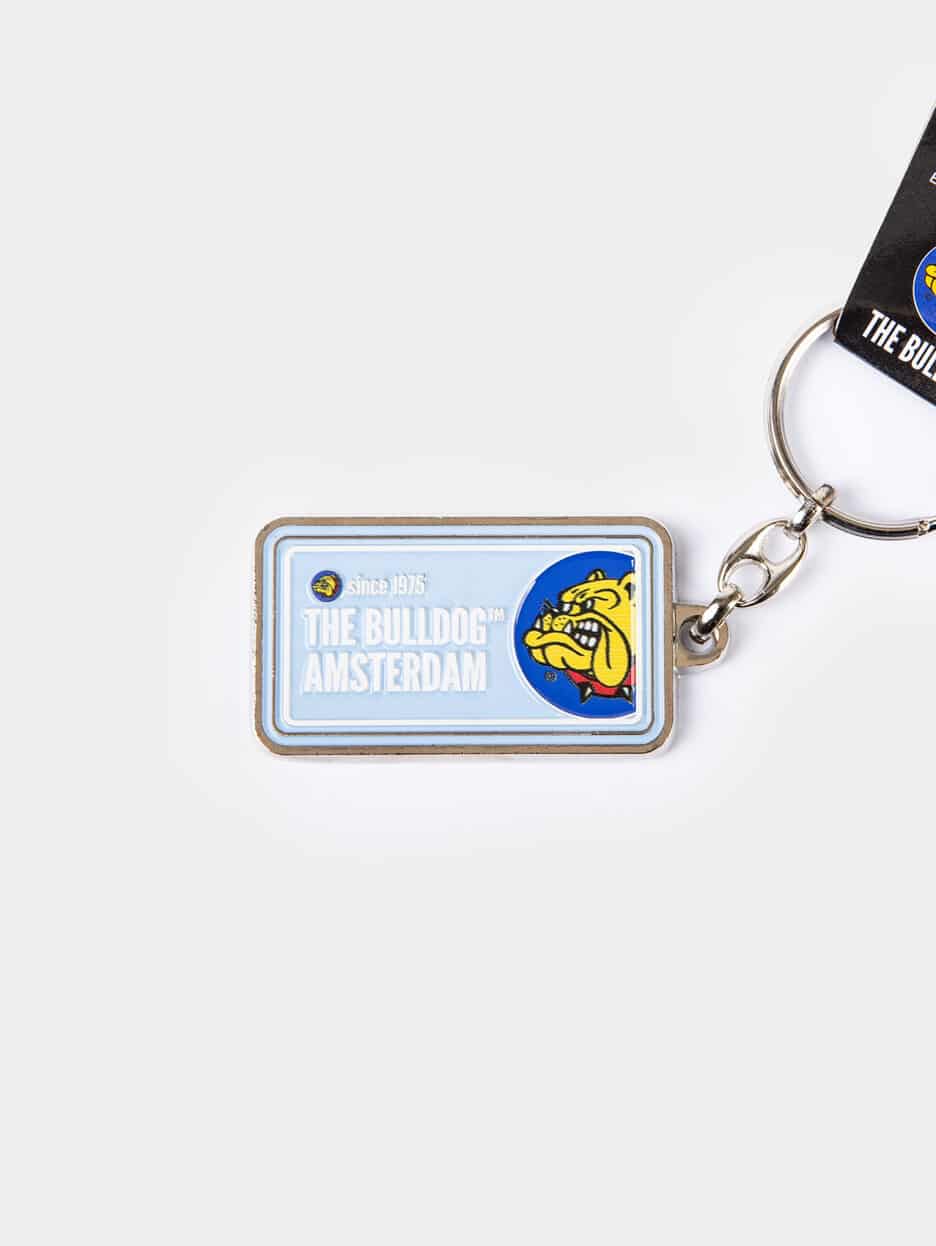A durable zinc‑alloy Keychain License Plate in Baby Blue featuring the full‑colour The Bulldog™ logo with metal ring