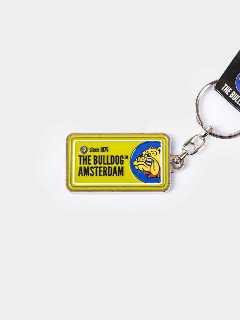 A durable zinc‑alloy Keychain License Plate in Lime Green featuring the full‑colour The Bulldog™ logo with metal ring