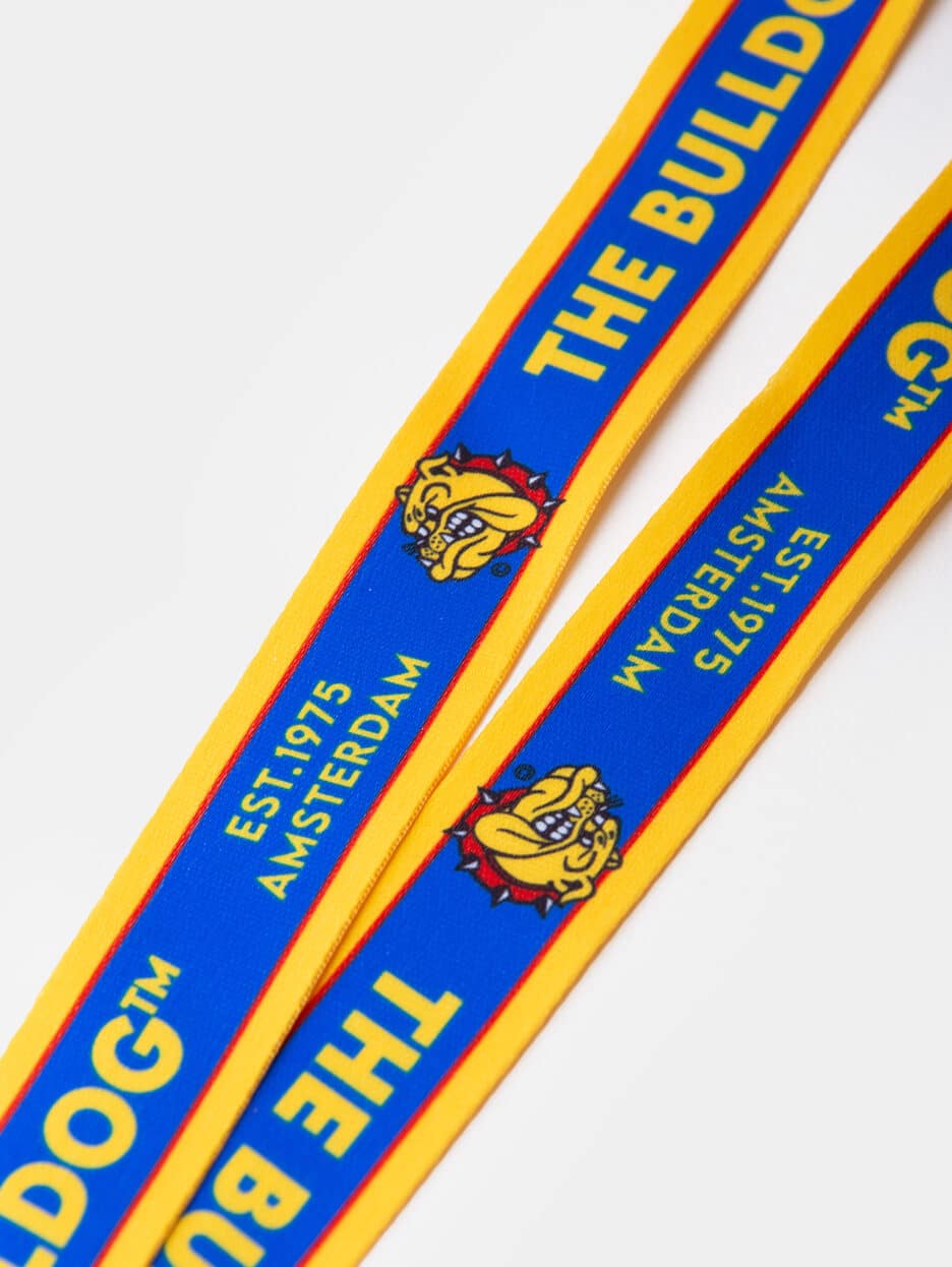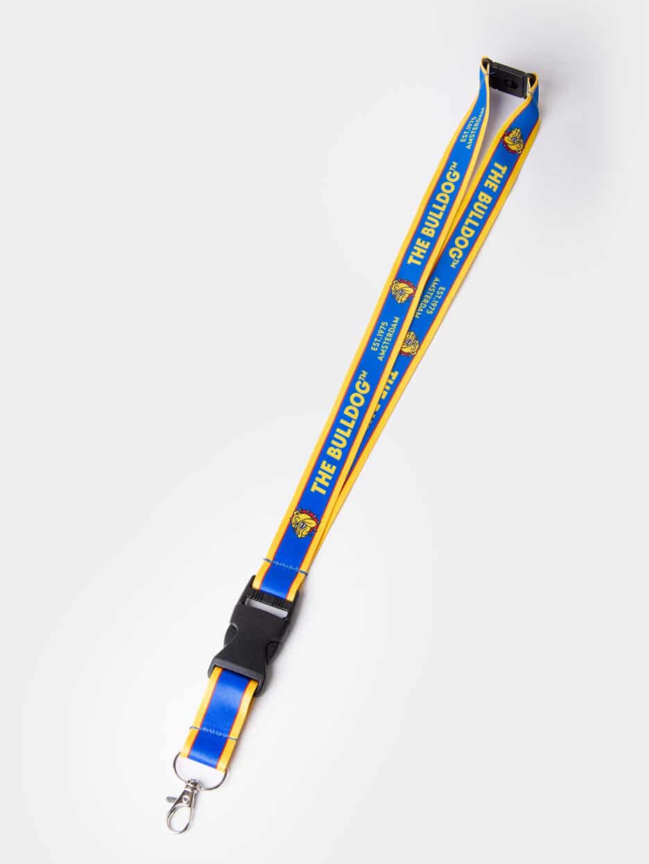 The Bulldog Lanyard Head in blue and yellow is a durable and practical accessory to keep your keys within reach. The lanyard features the iconic The Bulldog Head and text along the strap. It includes a quick-release neck closure and a secure front clasp that disconnects with the press of a button. Made from 100% nylon with a printed design, it also features a metal clasp to hold your keyring. The lanyard measures 53cm in length.